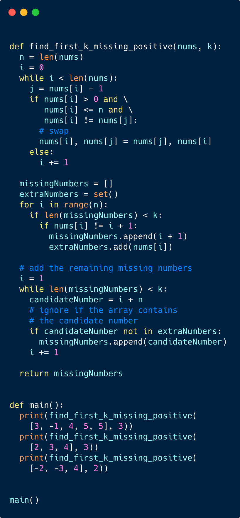 This problem follows the Cyclic Sort pattern and shares similarities with Find the Smallest Missing Positive Number. The only difference is that, in this problem, we need to find the first ‘k’ missing numbers compared to only the first missing number.