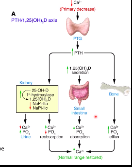 • Initiates synthesis of 1,25-dihydroxyvitamin D (1,25 (OH)2 vitamin D3) in kidney, as 1,25 (OH)2 vitamin D3 increases Ca2+ absorption from gut