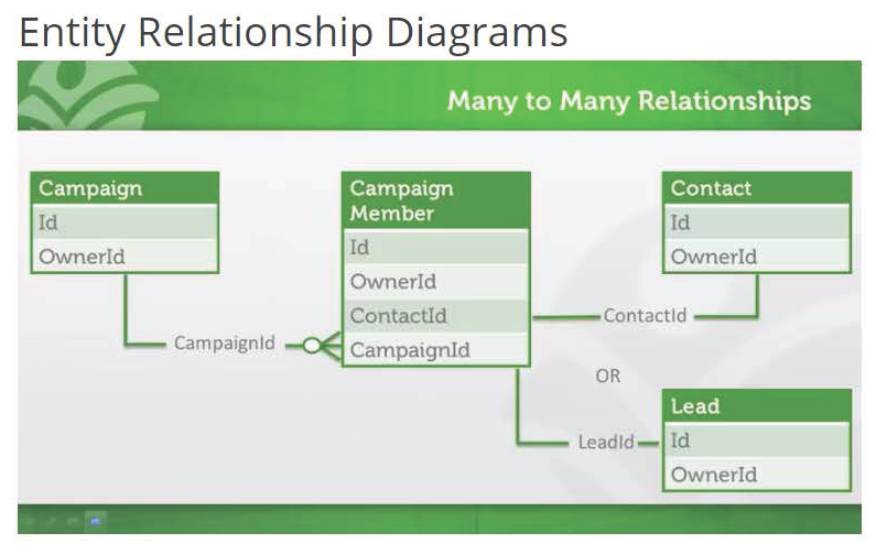 A Many to Many Relationship in Salesforce is established using a Junction or Join Object. The Join Objects Links each object of the Many to Many Relationship. A Many to Many Relationship consists of TWO, One to Many Relationships. Example: Contacts and Campaigns- the join is the Campaign Members. Each Contacts Membership in a Campaign is represented by a Campaign Member Record which also indicates that Contacts status within the Campaign.