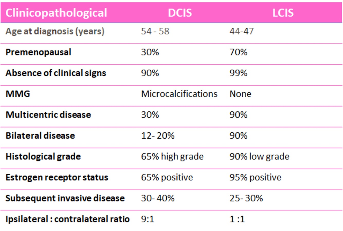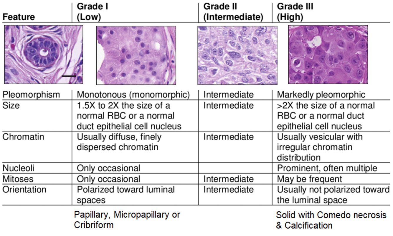 Atypical cells with abundant luminal necrosis filled within the duct- cells are large with pleomorphic nuclei & abnormal mitosis- necrotic material calcifies leading to microcalcification in MMG