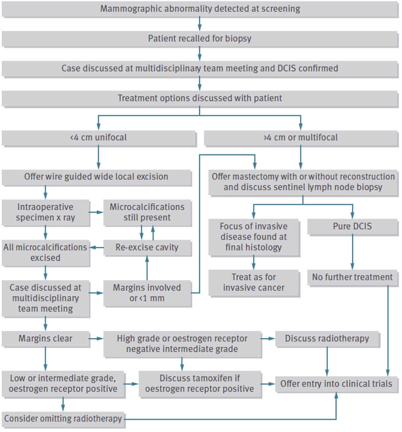- Patients with suspected DCIS should have a diagnostic bilateral mammogram with magnification views to assess the morphology and full extent of any calcifications.