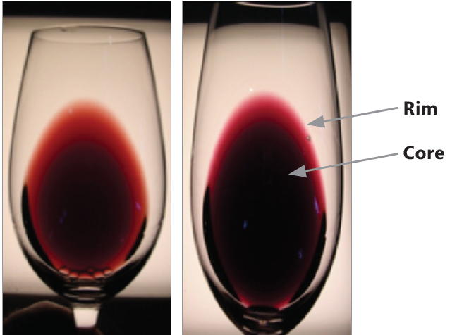 Rim variation often indicates age. The older the wine, the more variation there is likely to be. Youthful red wines may also show a slight rim variation, with bright pink, almost fuchsia-like hues at the edge.