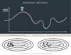In momentum, rather than taking a step in the direction of the current gradient, you take a step in the direction of **an exponentially decaying weighted sum of all past gradients**. The hope is that it helps you "power through" local minima to reach global minima. So for example, if you got to the bottom of this local minimum, the current gradient would be zero, but the previous ones are still pointing right and would carry you through. Another benefit is that momentum helps decrease jagged training. If the objective function is pointing in a consistent direction in one dimension (long side of ovals below), but prone to jumping around on another one (short side of ovals below), momentum smoothes this out.