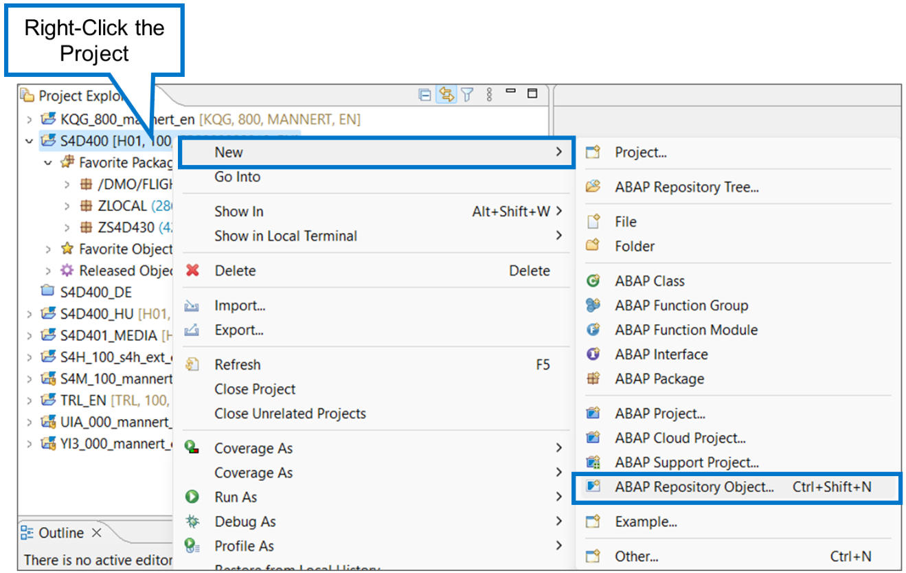 Right-click on the project in the Project Explorer, choose “New → ABAP Repository Object”, select “Core Data Services → Data Definitions” from the list, then proceed with entering the package name, data definition name, and description.