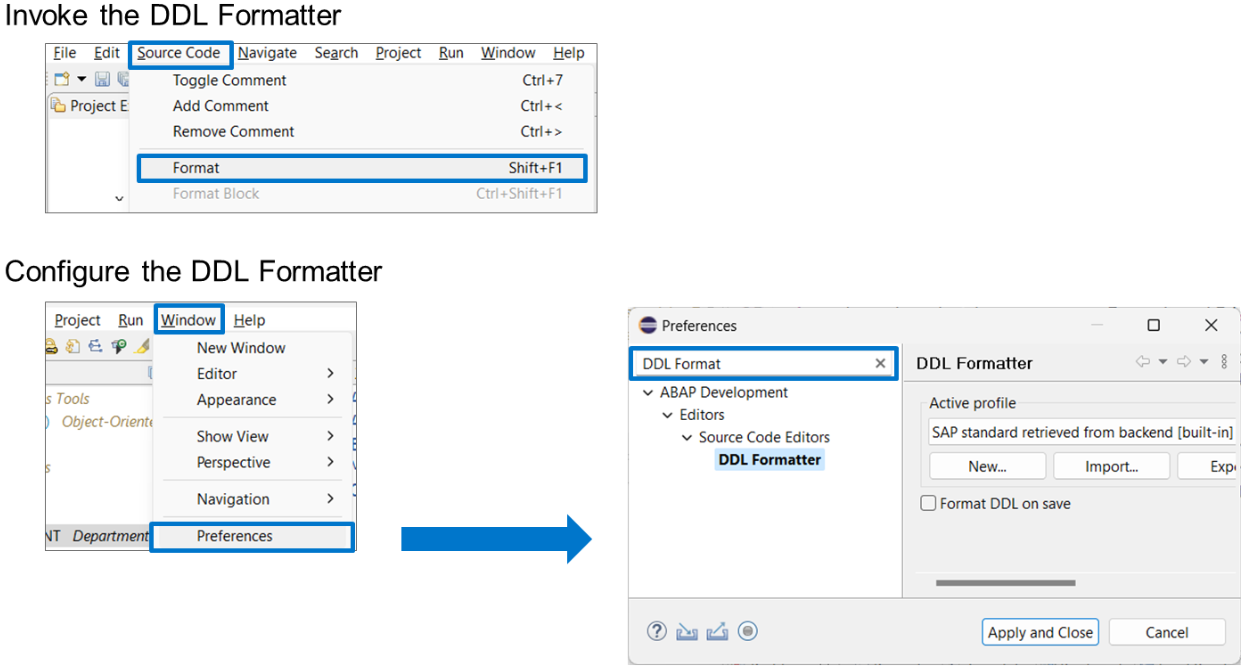 You can format the DDL source code of a data definition by placing the cursor somewhere in the definition and choosing “Source Code → Format” from the Eclipse menu, or by pressing Ctrl + F1. Additionally, you can define custom formatter profiles in the Eclipse Preferences dialog under “DDL Formatter”.