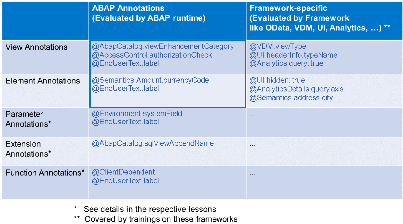 ABAP annotations are evaluated during activation or runtime and modify the behavior of ABAP SQL statements. Framework-specific annotations, on the other hand, define properties required by specific software components like ODATA, UI, or Analytics, and they are evaluated by the corresponding frameworks using suitable APIs.
