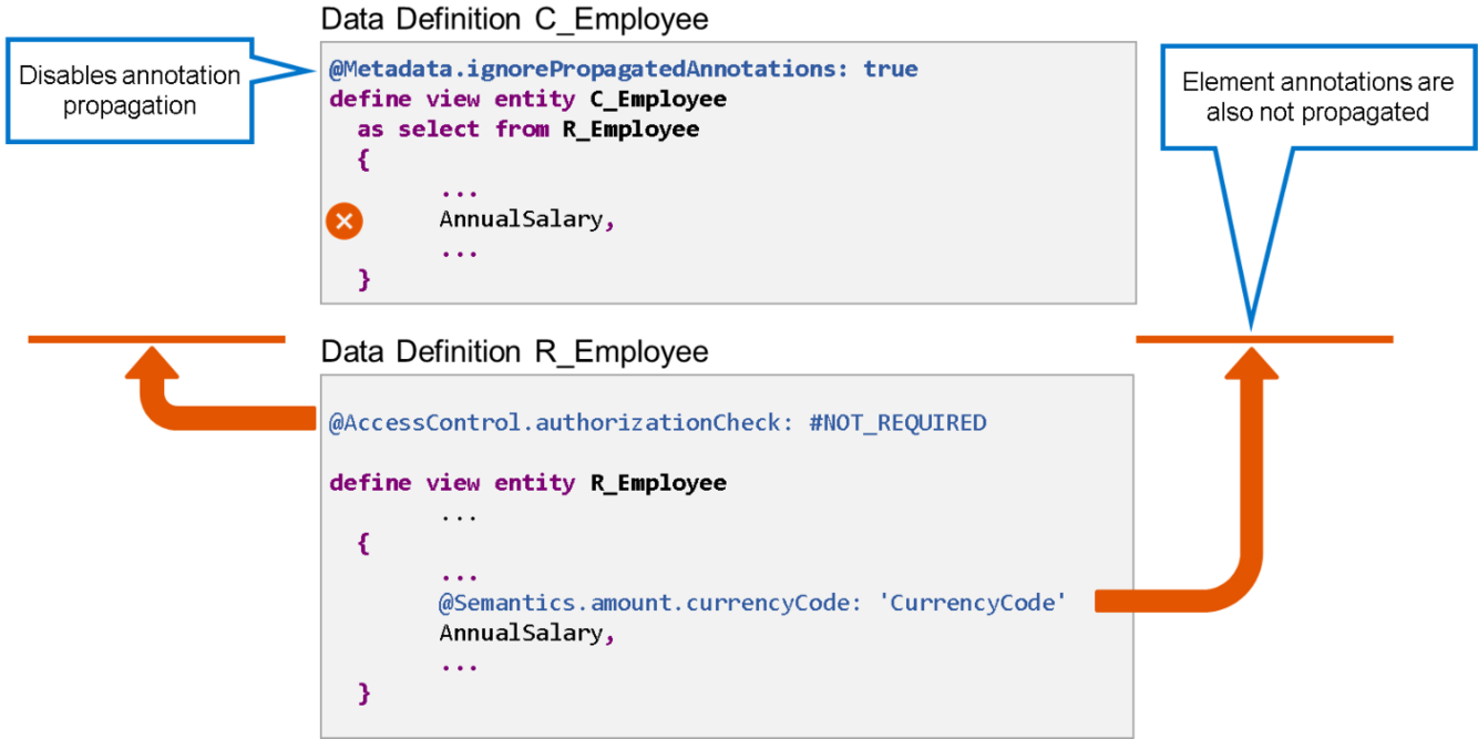 You can control annotation propagation using the entity annotation @Metadata.ignorePropagatedAnnotations. Setting @Metadata.ignorePropagatedAnnotations: true disables the propagation of element annotations from the source view entity to the target view entity.