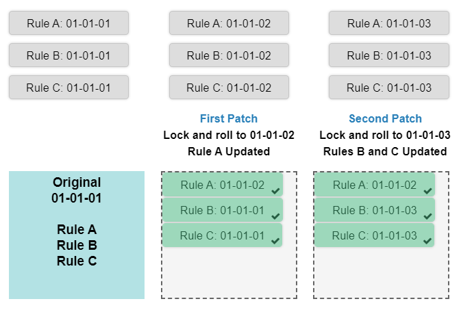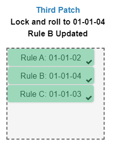 Based on the information given for each patch, if we had a 3rd patch where we Lock and Roll to 01-01-04 with Rule B updated, what are our resulting ruleset versions for A, B, and C?