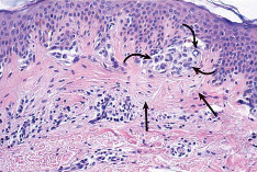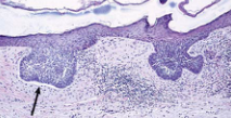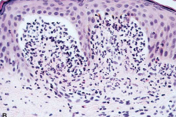 Microscopically, rete ridges and dermal papillae are elongated, giving a pattern of alternately reversed “clubs.” Neutrophils become localized in the epidermis or in small Munro microabscesses due to alterations in the capillary loops of dermal papillae.