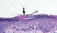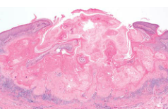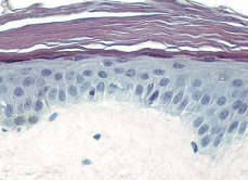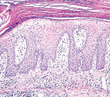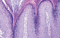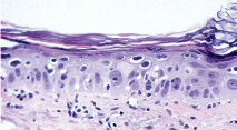 (image displays thickened stratum corneum, and think and focally absent stratum granulosum)