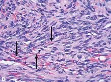 (note extravasated red cells, cytologic atypia of spindle cells, and formation of slit-like spaces)