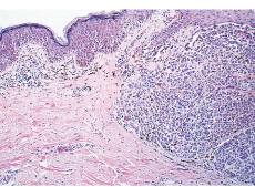 In the radial growth phase, cells grow in all directions. In the vertical growth phase, the dominant direction of tumor growth shifts to the dermis.