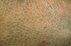 This heritable disease begins in early childhood, and features small white scales on the extensor surfaces of extremities and on the trunk and face. Biopsy reveals a thin stratum granulosum, which is due to reduced synthesis of profilaggrin. The stratum corneum is thickened.