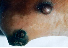 These cutaneous tumors are caused by HPV infection. They include common warts (on back of hand or face) and plantar warts (on soles of feet).