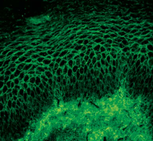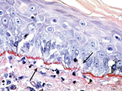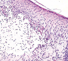 (image displays thickening of basement membrane zone and vacuolization on either side of the BMZ)