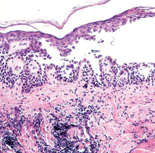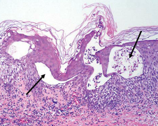 Pathologically, the blisters are subepidermal, with an edematous papillary dermis as its base and an intact epidermis as its roof.