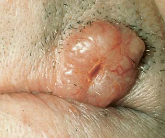 This disease develops on sun-damaged skin of people with fair skin and freckles. It features pearly nodules, that upon biopsy reveal buds of atypical, deeply-basophilic keratinocytes extending from the overlying epidermis into the papillary dermis.