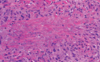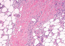Biopsy discloses focal hemorrhage, neutrophilic infiltrates in the subcutaneous fibrous tissue septa, and giant cells at the interface between the septa and adipose tissue.