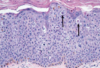 (image displays bridging of rete ridges and melanocytes with cytological atypia, curved arrows)