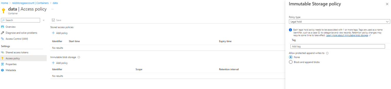 Add a policy for immutable blob storage and select either Legal Hold or Time Retention