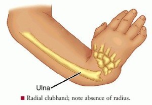 2. Marked deformity known as radial club hand