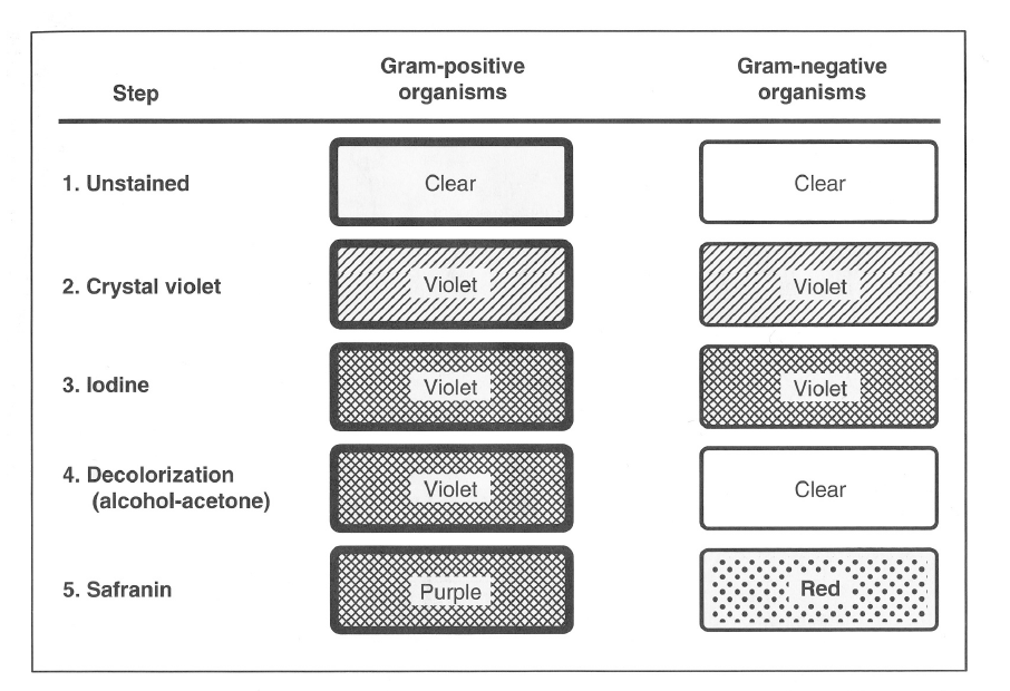 Le cristal violet n’a pas été décoloré par l’acétone alcool: la contre-coloration à la safranine (rose) a été inefficace. La couleur finale de la bactérie est bleue ce qui implique une paroi pauvre en lipide : bactérie Gram positif (ex. : Staphylococcus).