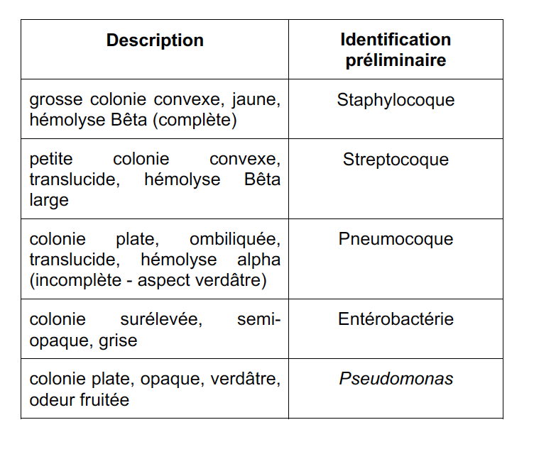 Donner 5 exemples d’identification préliminaire de bactéries selon l’aspect macroscopique