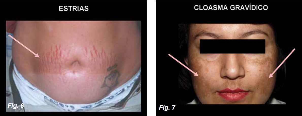 Estrias, cloasma gravídico (hiperpigmentação da face), linha nigra (concentração de melanina na linha alba), sinal de Halban (aumento da lanugem nos limites do couro cabeludo).