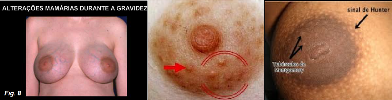 Tubérculos de Montgomery: são glândulas mamárias acessórias e sebáceas hipertrofiadas. 8a semana. Rede de Haller: aumento da vascularização venosa nas mamas. 16a semana. Sinal de Hunter: aumento da pigmentação dos mamilos e areola mamária com limites impreciso. 20a semana.