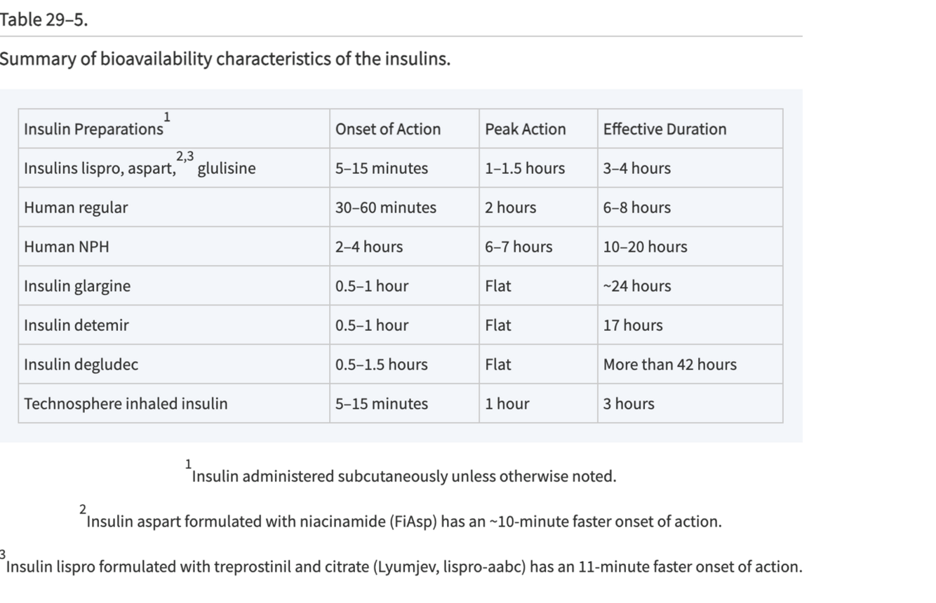 -Basal Insulins – Long acting; once or twice a day; rarely cause hypoglycemi -> Glargine; detemir; degludec