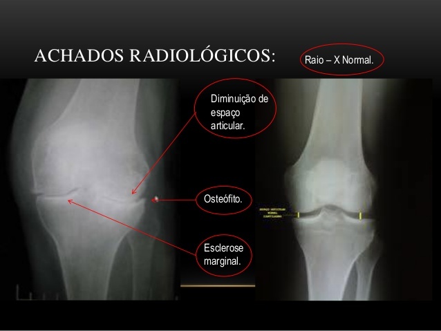 Imagem: diminuição do espaço articular, esclerose subcondral, neoformação óssea, osteófitos