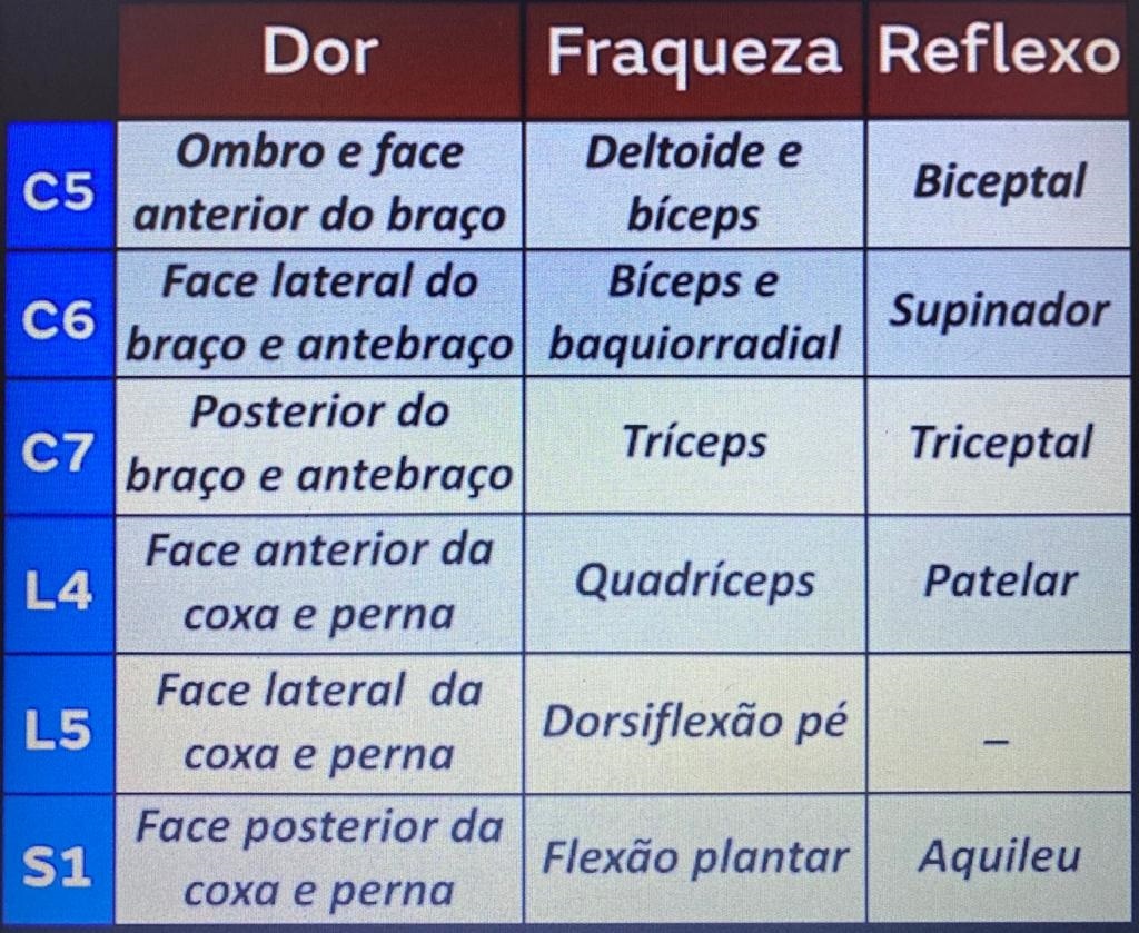 Indique a que região do corpo corresponde a raiz nervosa, como se dá a fraqueza e a alteração de reflexo…