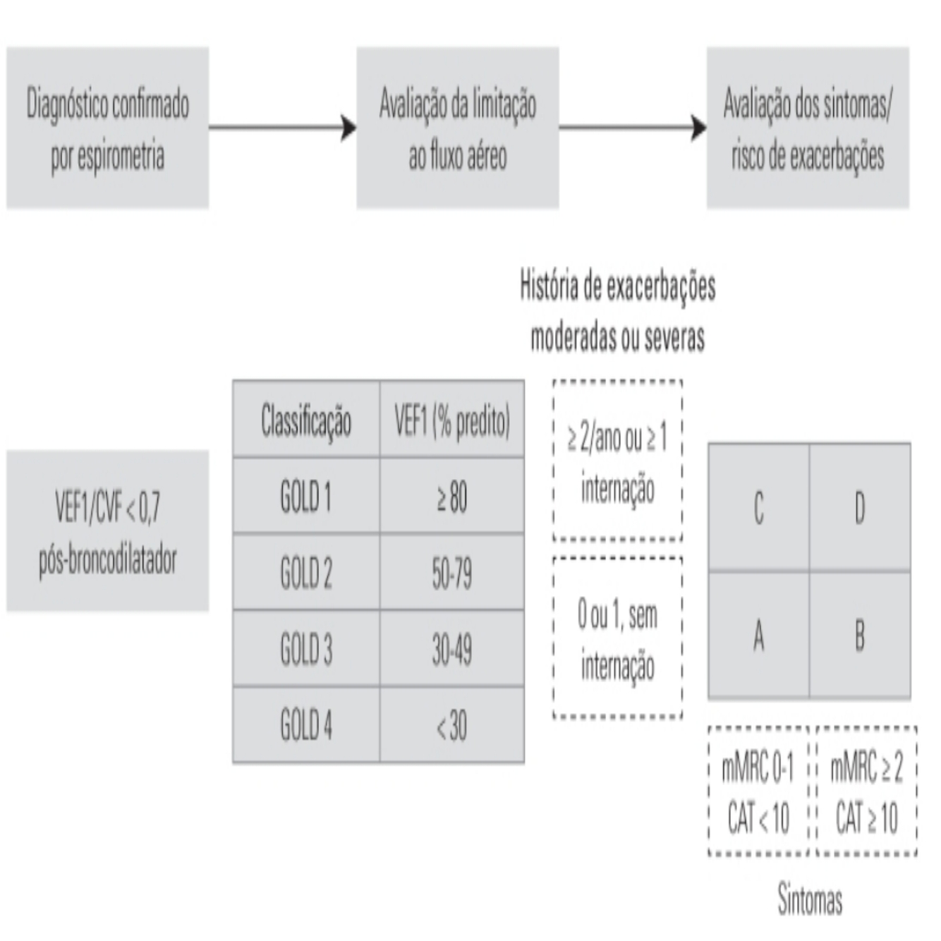 Considerar DPOC em pacientes com dispneia, tosse cronica, catarro, histori de infecções recorrentes das VAI, associdos ao tabagismo ou outros fatores de risco