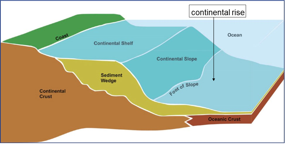 describe and name the areas at a passive margin boundary between continent - ocean transition.