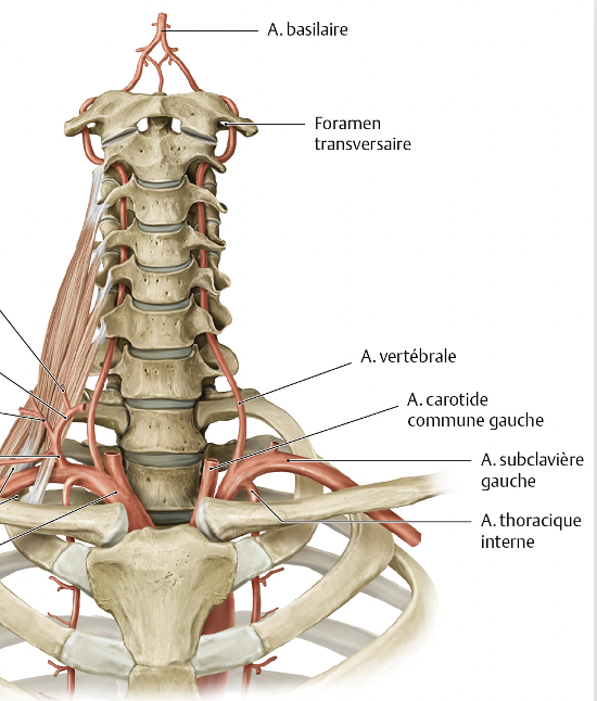 * monte verticalement de C6-C2 puis tourne latéralement vers le foramen transversaire de C1