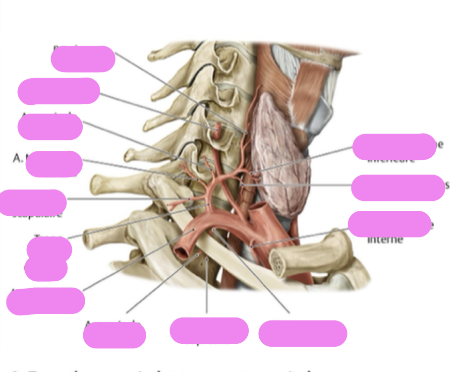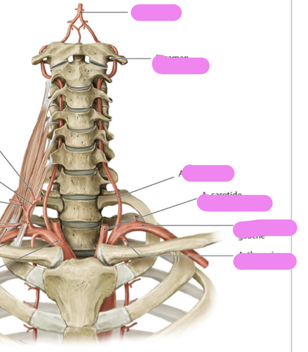 * Passé le foramen transversaire de ?, se dirige … et …, puis … et vers l’…, pour contourner les … , passer sur le sillon de l’… de l’arc … et pénétrer la membrane …