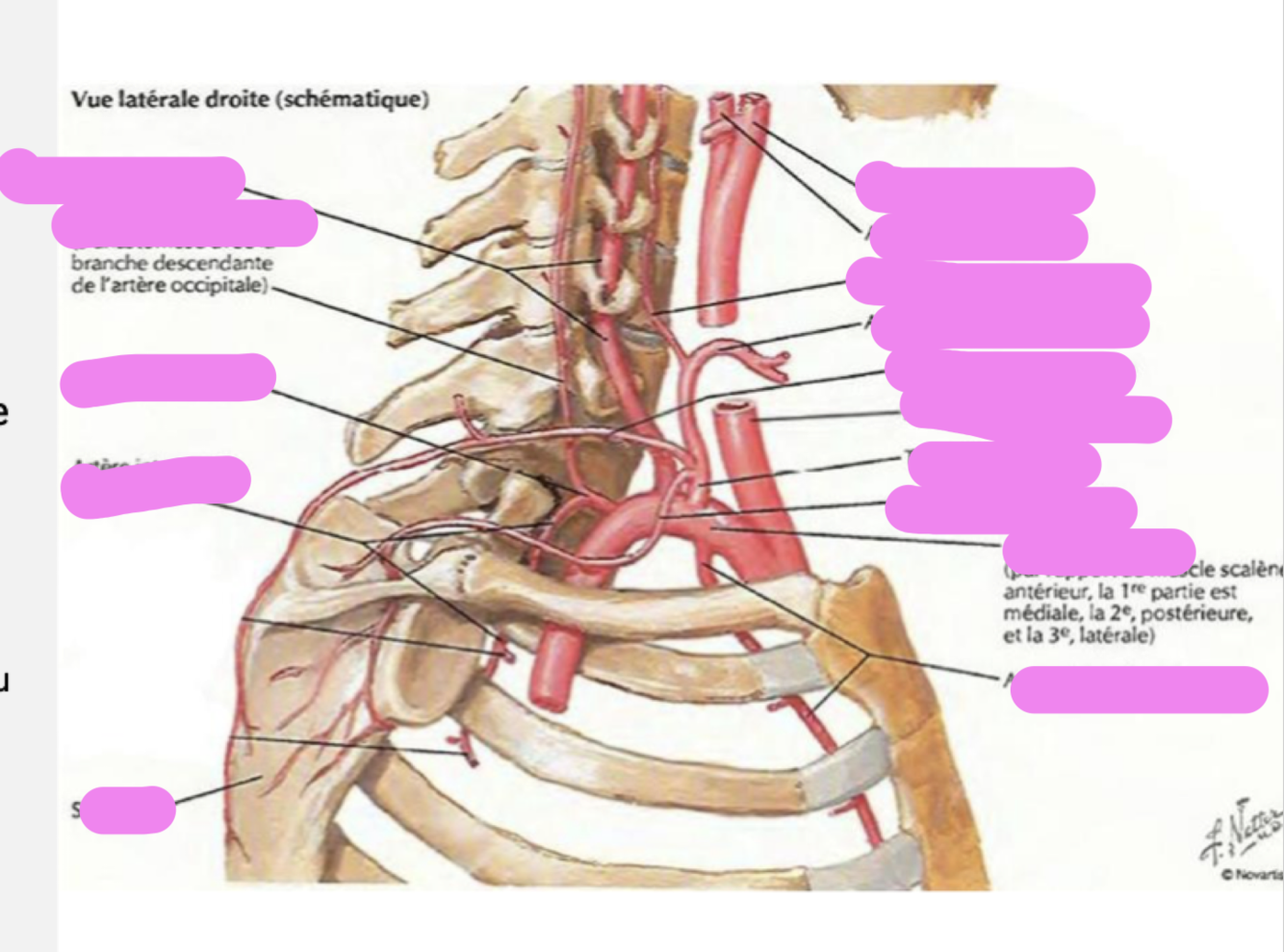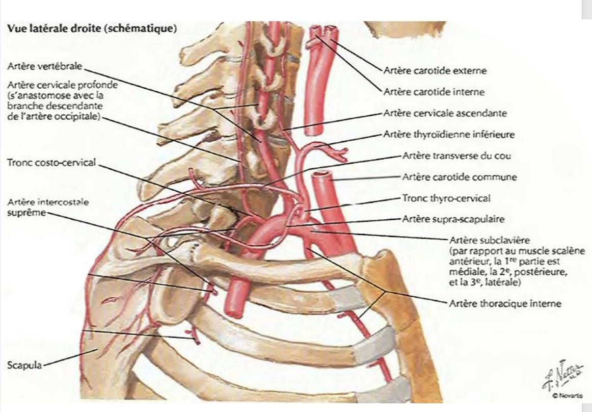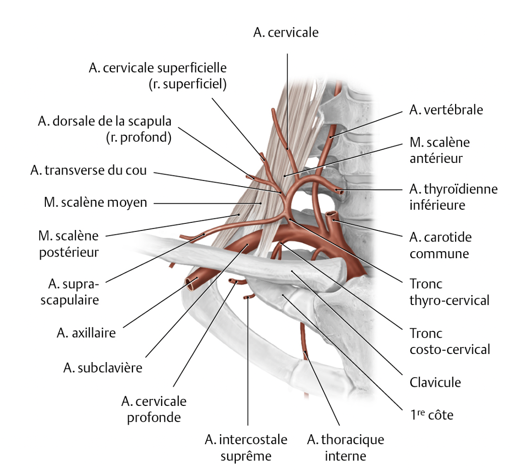 L’artère subclavière court vers le latéral postérieure à l’attache du m. scalène antérieur sur la 1re côte.