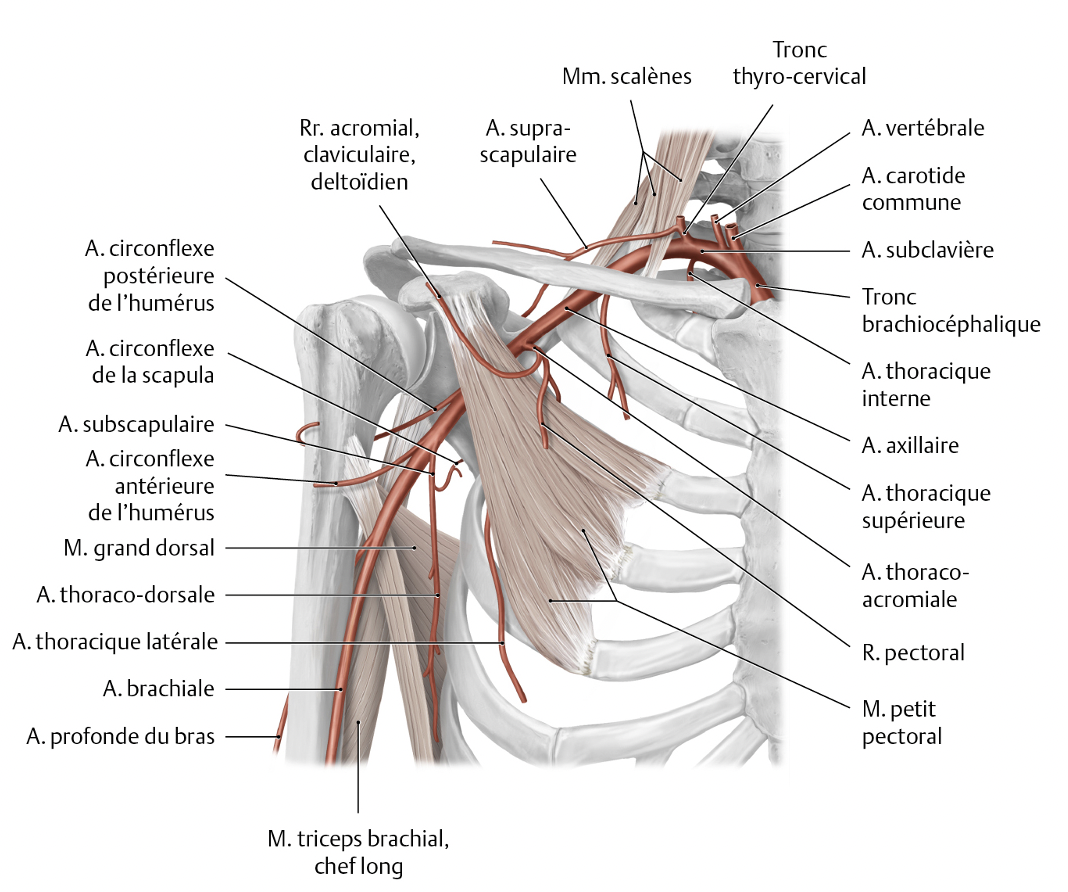 Continuation directe de l’a. subclavière, l’a. axillaire naît au bord latéral de la 1re côte.