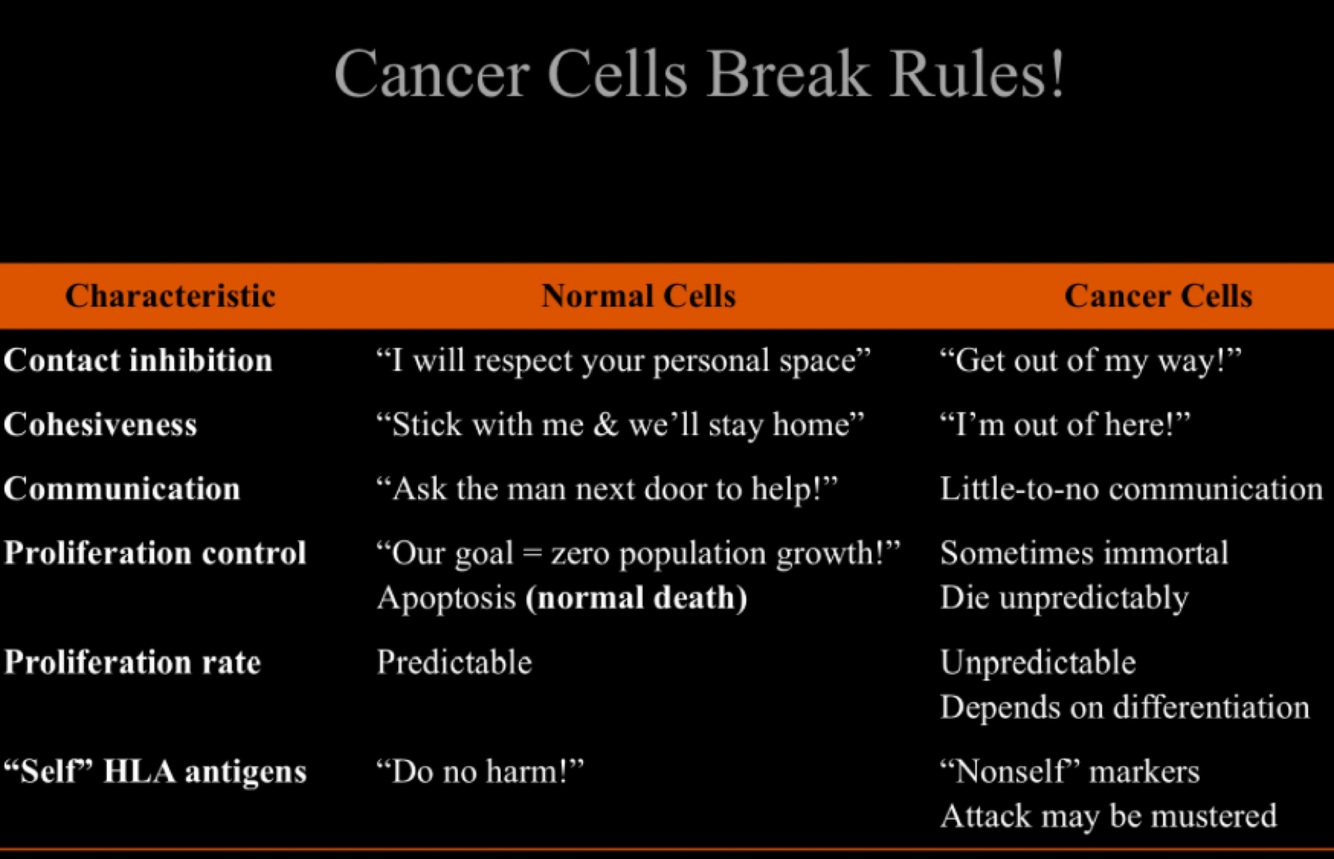 the growth inhibitors released by neighboring cells -> as they proliferate, they accumulate on top, around & besides each other, take over boundaries of organs, crowd out normal cells and may even breakfree and travel to distant body sites