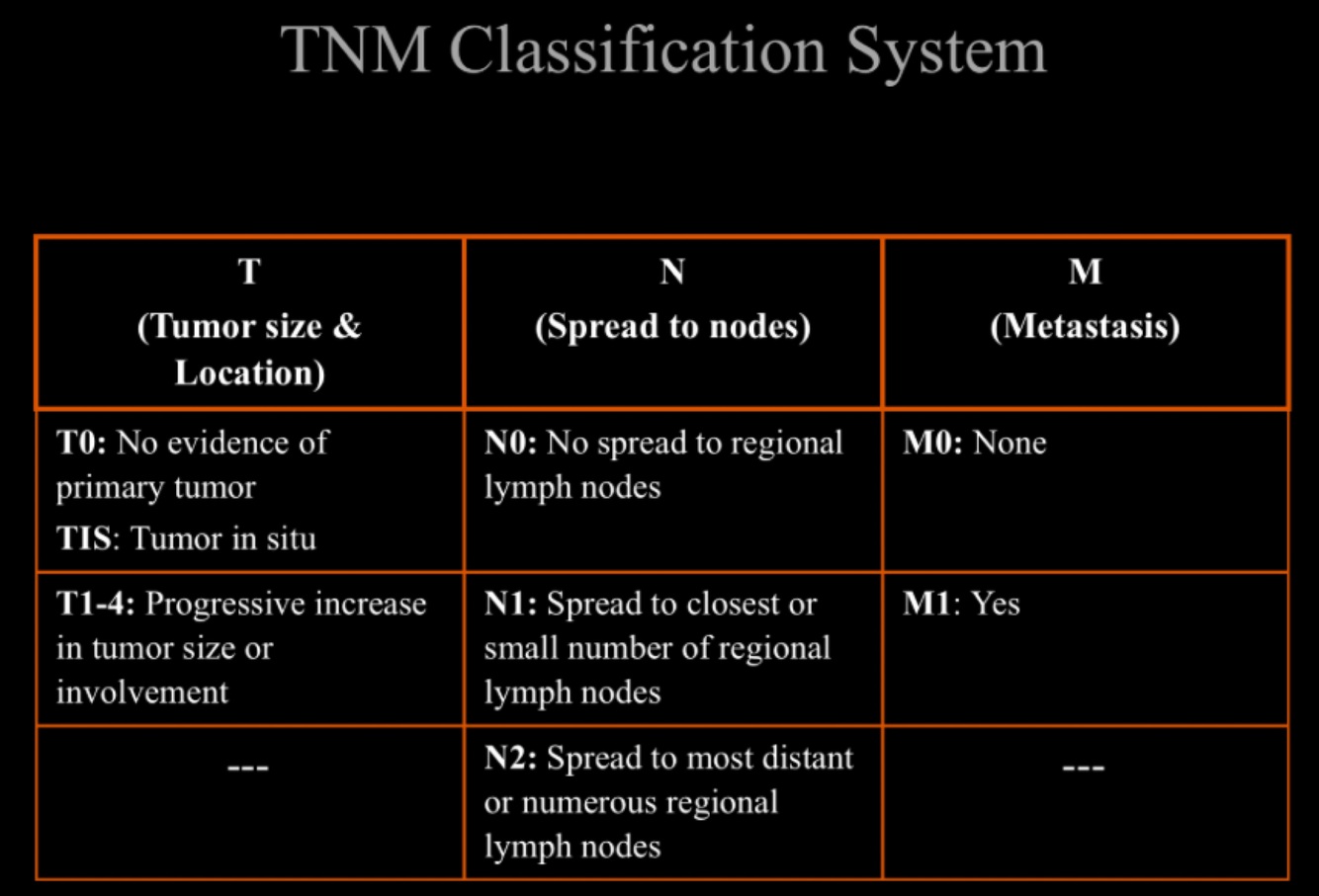 Staging classifies the tumor according to size, invasiveness, and spread using a TNM system: