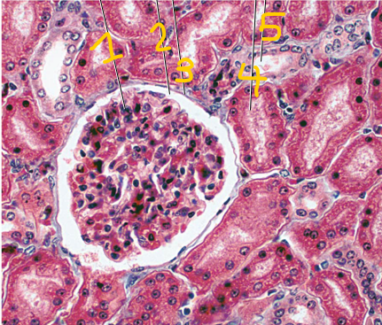 4: proximal convoluted tubule (fuzzy due to long microvilli)