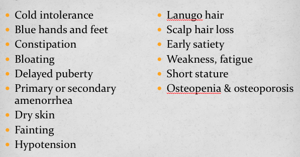 Dry Skin, Cold intolerance, Blue hands and feet, constipation, abdominal bloating, delayed puberty, Primary or secondary amenorrhoea, fainting, hypotension, lanugo hair, scalp hair loss, weakness and fatigue, short stature,