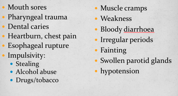 Relies on compulsive compensatory behaviours when food cannot be avoided, Self induced vomiting, laxative abuse, excessive exercise, abuse of appetite suppressants / diuretics