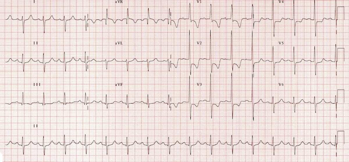 Discordant ST segment depression and T wave inversion in L sided (lateral) leads