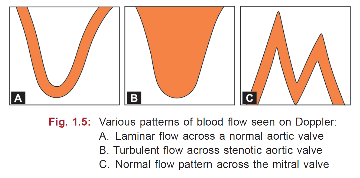 Turbulent blood flow (i.e. stenotic valve) = wide distribution of velocities of RBCs (spectral broadening, high variance, increased band width) = filled in appearance of Doppler signal.