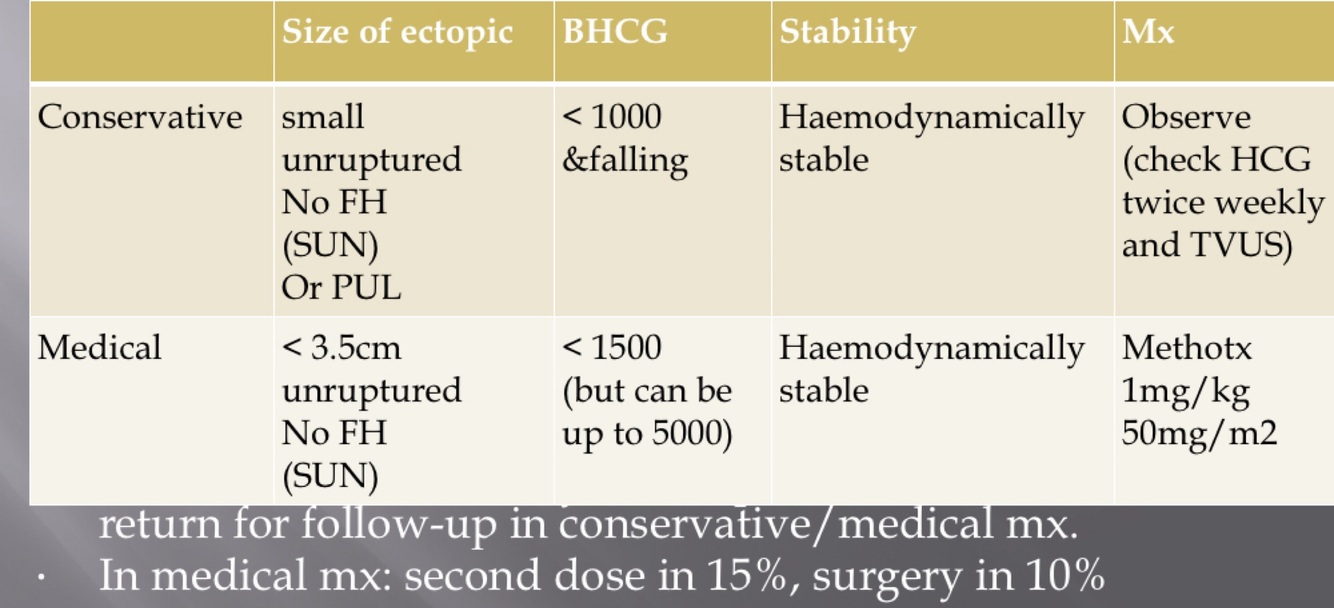 When is surgical management needed for an ectopic? (5)