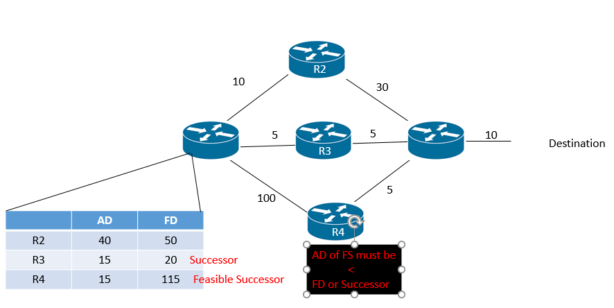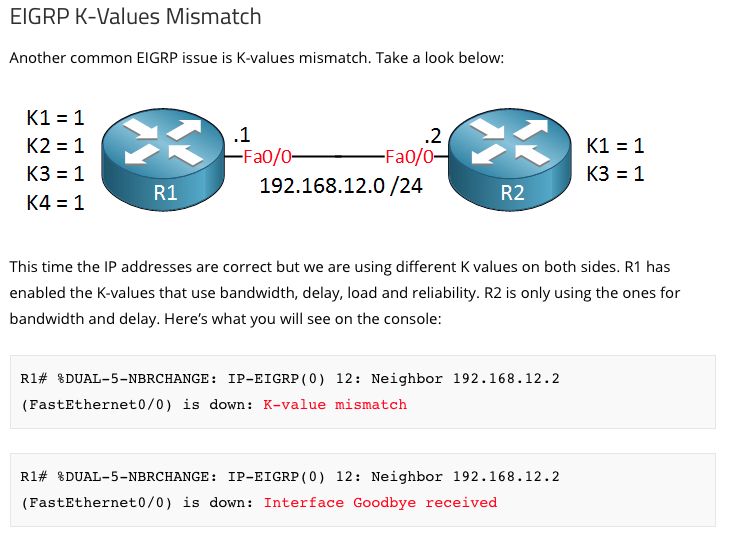 K value mismatch: By default bandwidth and delay are enabled for the metric calculation. We can enable load and reliability as well but we have to do it on all EIGRP routers.