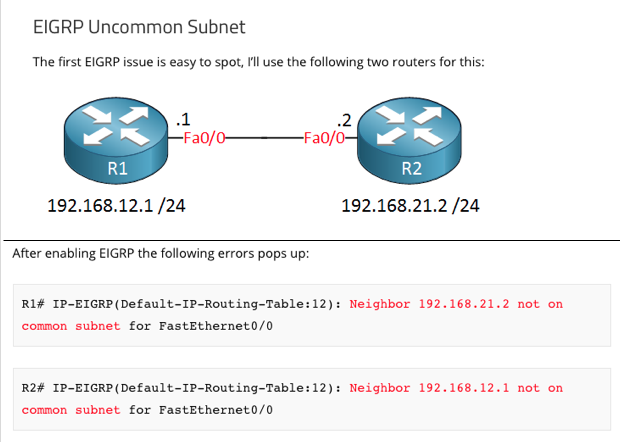 Uncommon subnet: EIGRP neighbors with IP addresses that are not in the same subnet.