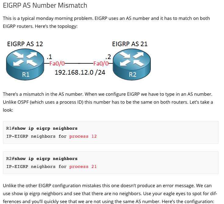 Layer 2 issues: EIGRP works on layer 3 of the OSI-model. If layer 1 and 2 are not working properly we’ll have issues with forming a neighbor adjacency.