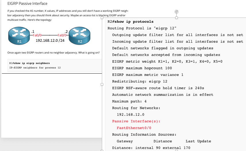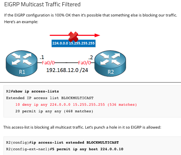 Access-list issues: It’s possible that someone created an access-list that filters out multicast traffic. EIGRP by default uses 224.0.0.10 to communicate with other EIGRP neighbors.